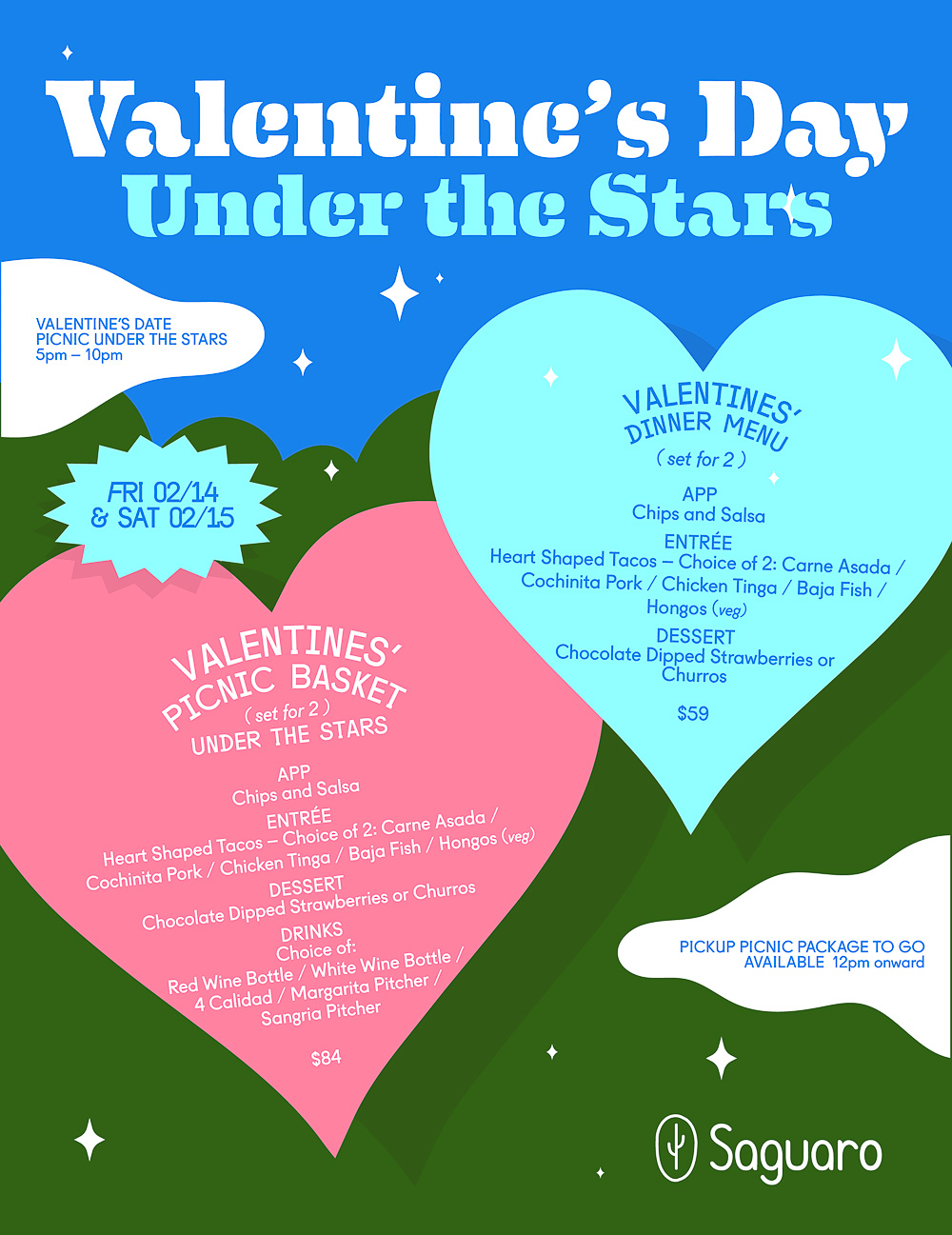 - Entrée (choose 2): Heart-Shaped Tacos – carne asada, cochinita pork, chicken tinga, Baja fish, or hongos (vegetarian)